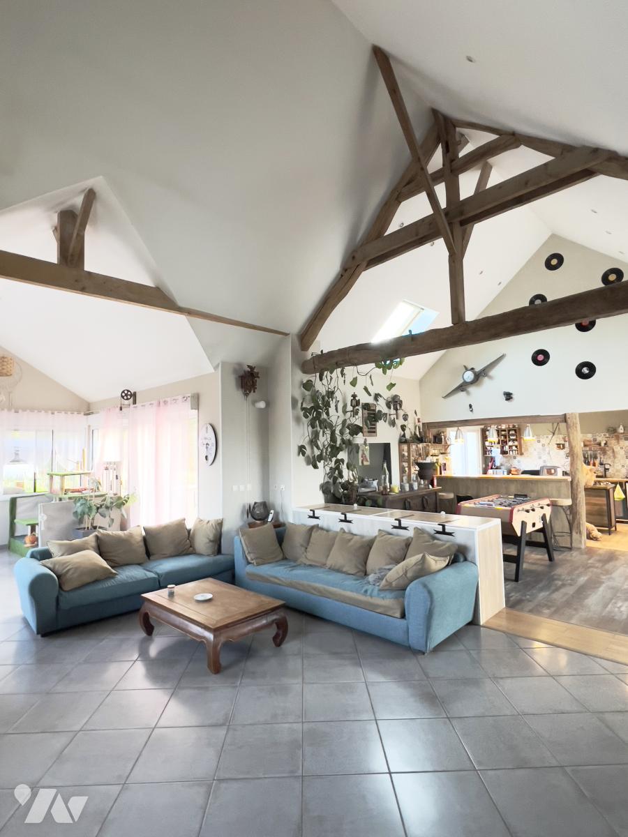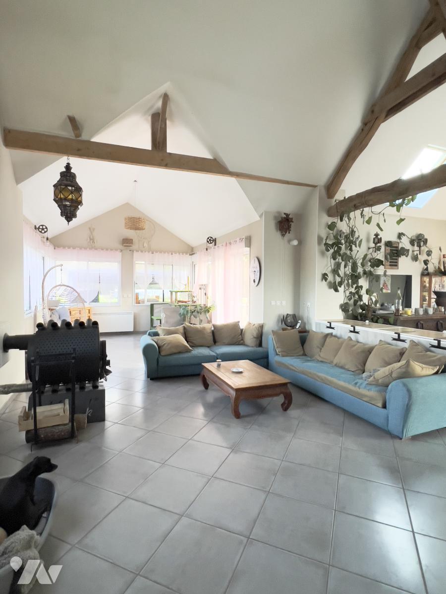 Dans un environnement paisible, en bordure de forêt, beaucoup de charme pour cette maison disposant d'espaces de vie vastes et lumineux. Cette maison se compose : entrée, cuisine aménagée et équipée ouverte sur la pièce à vivre avec poêle à bois, suite parentale : chambre, salle d'eau avec wc, dressing, salle de bains, wc, chambre, buanderie. A l'étage : chambre à terminer. Grenier. Terrasse, Piscine hors sol, mare, bûcher, abris de jardin, petites dépendances. Le tout sur un vaste terrain d'environ 7 665 m2.